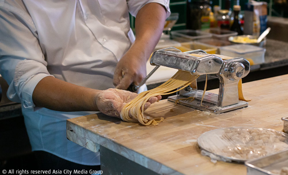 ชื่อของ 00 Pasta มาจากแป้งสาลีเบอร์ 00 ซึ่งเชฟอธิบายว่า เป็นแป้งที่มีปริมาณของโปรตีนและกลูเตนที่เหมาะสมที่สุดในการทำเส้นพาสต้า โดยลูกค้าที่มาก็สามารถนั่งที่เคาน์เตอร์บาร์ เพื่อชมการทำเส้นพาสต้าสด ๆ จากเชฟได้เลย โดยเส้นพาสต้าที่ร้านจะทำแบบวันต่อวัน โดยเริ่มต้นทำวันละ 5 เสิร์ฟ แล้วทำเติมเรื่อย ๆ ไม่มีการเก็บค้างคืนให้เสียคุณภาพและรสชาติในแป้ง ซึ่ง ณ วันที่เราไปชิมนั้น เชฟเล่าว่าตอนนี้ที่ร้านมีพาสต้า 8 อย่างด้วยกัน แต่กำลังเล็งที่จะเพิ่มอีกหลาย ๆ แบบ