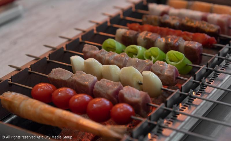 ความสนุกหรรษาอีกอย่างของร้านนี้คือเตาปิ้งที่บันเทิงพอ ๆ กับผง Yanbian เพราะที่ร้านนี้เขาอิมพอร์ตเอาเจ้าเตาปิ้งระบบไฮโดรลิกนี้ส่งตรงมาจากเมืองจีน หน้าที่ของเราคือแค่วางไม้บาร์บีคิวที่ทางร้านเสียบเนื้อสัตว์และผักมาให้เรียบร้อยแล้วลงบนเตาให้ลงล็อกพอดี (คล้ายกับการวางฟิล์มให้ตรงกับรูหนามเตยนั่นแหละ) หลังจากนั้นก็เป็นหน้าที่ของเจ้าเตาอัจฉริยะที่จะหมุนเนื้อสัตว์ของเราให้สุกเท่ากันทุกด้านแบบพอดิบพอดี ใครที่ใจร้อนอยากให้สุกไวหน่อย ก็สามารถกดปุ่มเลื่อนเตาถ่านไม้กะลามะพร้าวแบบไร้ควันให้สูงขึ้นมาอีกนิดได้ด้วยนะ เก๋มากเวอร์