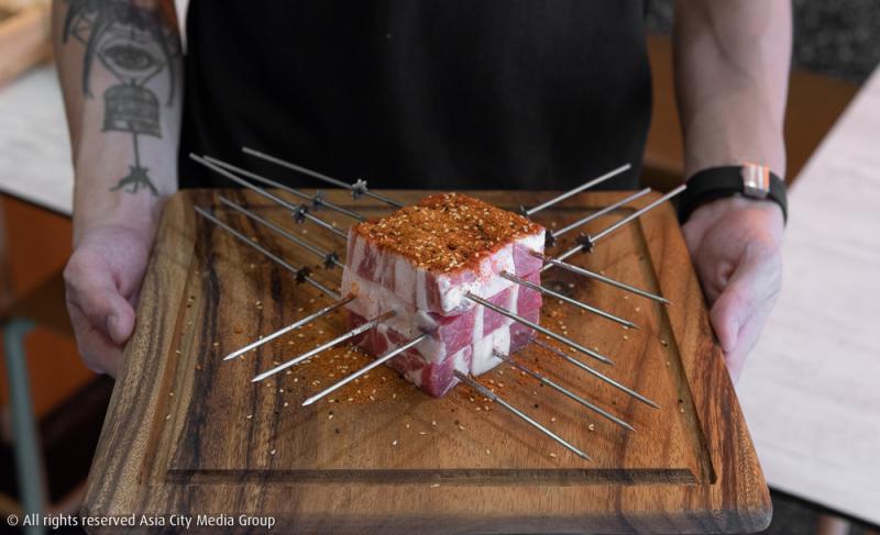 ส่วนคอเนื้อที่แท้ทรูก็อย่างลืมสั่ง Bad-B-Cube (350 บาท) ล่ะ เพราะมันคือเนื้อหมูและเนื้อวัวที่วางซ้อนกัน 9 ไม้จนกลายเป็นเจ้าก้อนเนื้อทรงลูกเต๋าขนาดใหญ่ให้ปิ้งกันเพลิน ๆ ยันดึก ซึ่งจุด ๆ นี้ใครปิ้งแล้วจะโรยผง Yanbian หรือจิ้มน้ำจิ้มสูตรพิเศษของร้านที่มีทั้งน้ำจิ้มแจ่วและน้ำจิ้มแจ่วบองสุดแซ่บนัวก็ได้ทั้งนั้น