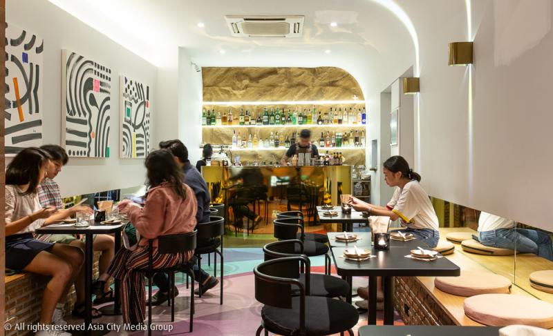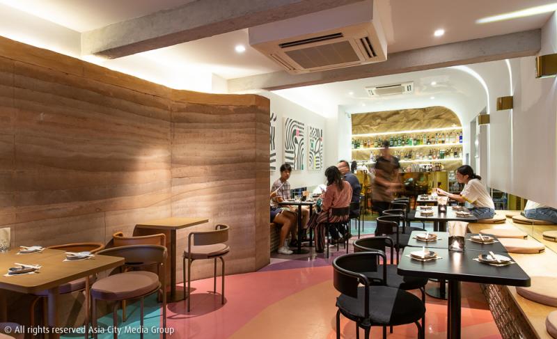 การตกแต่งหลักของร้าน Bambino ให้บรรยากาศเหมือนเราเดินลงมาในถ้ำใต้ดินตั้งแต่ก้าวแรกที่ก้าวเข้ามา มีการใช้โทนสีเอิร์ธโทนบนผนังและที่นั่ง พร้อมเพิ่มดีเทลน่ารัก ๆ ด้วยรูปวาดและพื้นห้องสีสันสดใสให้สมกับธีม 'Adult Playground' ที่ คุณบาย-อัชฌา วงศ์จินดาเวศย์ เจ้าของร้านนี้ตั้งใจสร้างมู้ดให้ Bambino เป็นร้านอิซากายะที่ไม่เหมือนใคร เหมาะกับให้ผู้ใหญ่วัยทำงานอย่างเรามานั่งเล่นระเหยหัวใจไปกับบรรยากาศแบบเฟรนด์ลี่ อาหารคุณภาพดี และค็อกเทลชั้นเลิศ