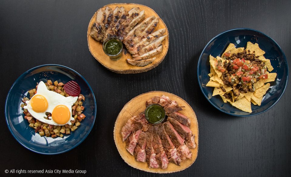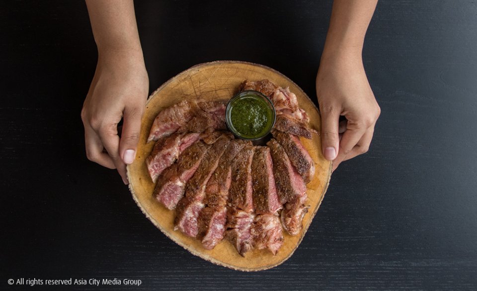 เนื้อถูกสไลด์เป็นชิ้นพอดีคำ กินเปล่า ๆ จะสัมผัสได้ถึงความชุ่มน้ำ juicy สุดมันปาก แต่ถ้าจิ้มซอส Chimichurri (ชิมิชูรี) สีเชียว ๆ จากโหระพา ใบมินท์ ผักชี ผักชีฝรั่ง ก็จะได้รสชาติอีกขั้วเลย