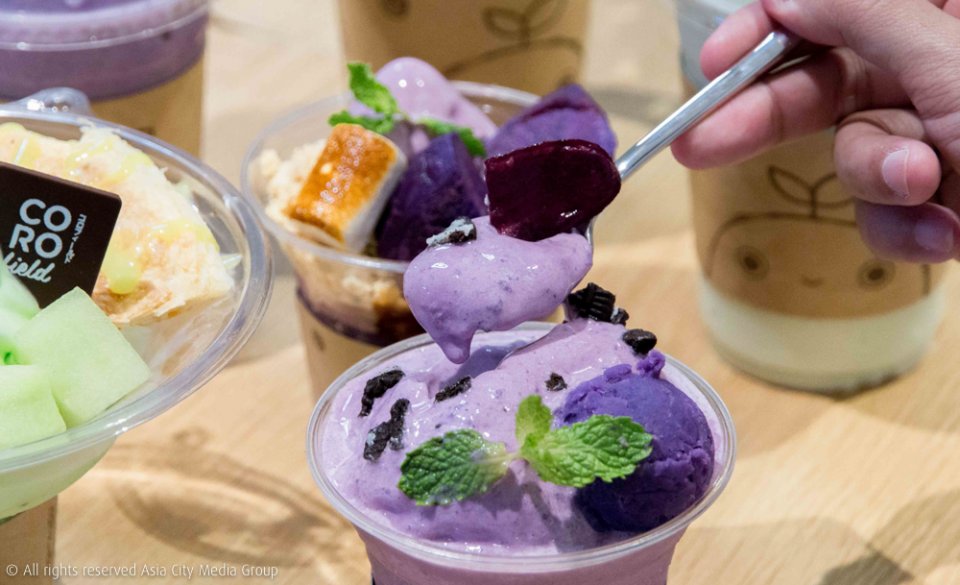 เมื่อเดินมาถึงร้านขนมหวานโฮมเมด Coro Field Dessert สาขาใหม่ในเซ็นทรัลเวิลด์ ด้านข้างของร้านจะมีตู้แช่ที่มีผลเมล่อนที่นอนเรียงรายอยู่ ไม่บอกก็รู้แล้วว่าไฮไลต์ของร้านนี้คือเมล่อนแน่นอน แต่ก็ไม่ได้มีแค่เมล่อนอย่างเดียวเท่านั้นเพราะเมนูที่เด็ดไม่แพ้กันเลยก็คือมันม่วง