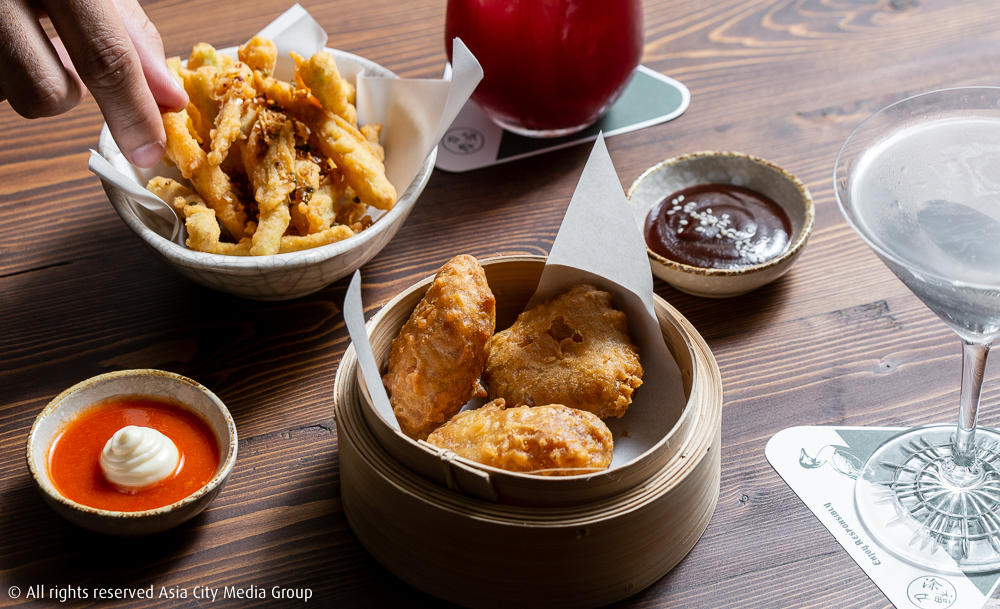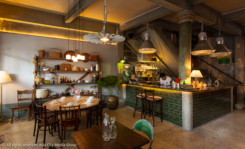 ตัวบาร์ยาวถูกจัดวางไว้ห้องด้านในสุดเพื่อเตรียมพร้อมสำหรับทำการเสิร์ฟเครื่องดื่มมีดีกรี อาทิ โลคัลเบียร์จากจีน แซงเกรียสูตรพิเศษ และค็อกเทลที่ถอดแบบมาจากยุคแก๊งสเตอร์ครองเมืองในปี 1950-1960 ที่ทั้งพี่โจ็กและพี่วู้ดดี้บอกว่าเจอกันแน่เร็ว ๆ นี้ (หลังรัฐบาลปลดล็อก) โดยใครที่ไปเยี่ยมเยียนร้านในช่วงนี้ก็สามารถโฟกัสไปที่เมนูอาหารแบบเพียว ๆ ก่อนได้เลย เราชอบการวางคอนเซปต์อาหารของร้านนี้ที่ตั้งใจจะเสิร์ฟอาหารสไตล์ Sino-Southeast Asian โดยใช้รากอาหารจีนเป็นหลัก ผสมผสานกับจานคลาสสิกจากฝั่งเอเชียตะวันออกเฉียงใต้อย่าง อาหารเวียดนาม มาเลเซีย สิงคโปร์ รวมถึงไทยเข้าไปอีกนิด ใส่กลิ่นอายตะวันตกตามสมัยยุคโลกศิวิไลซ์ช่วง 60s ลงไปอีกหน่อย พร้อมจัดจานหน้าตาสวยงามตามท้องเรื่องมาในพอร์ชันไซซ์ทาปาสไว้แชร์กันกับครอบครัวและเพื่อนฝูงตามสโลแกน Family Hungry Place