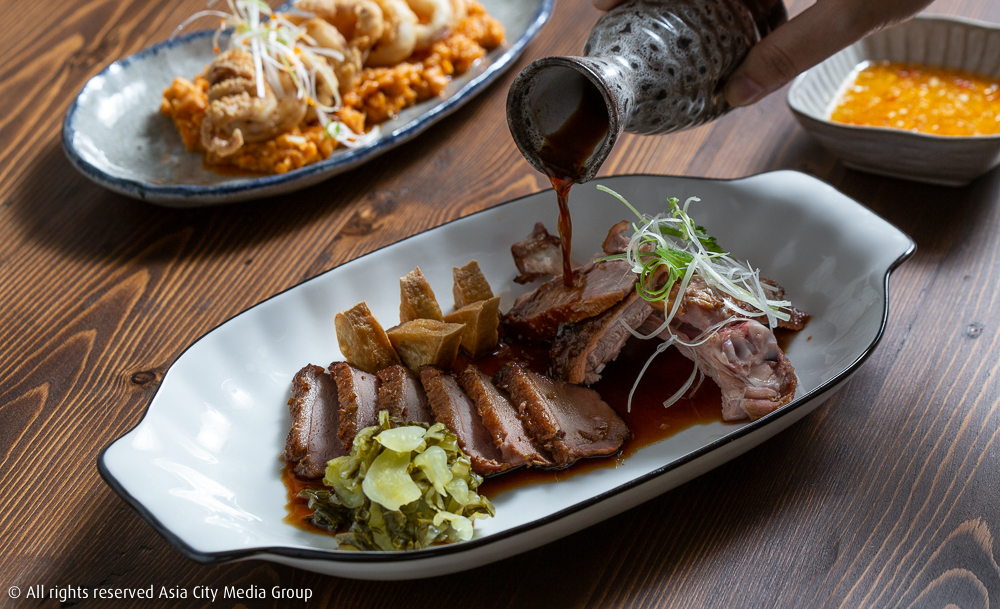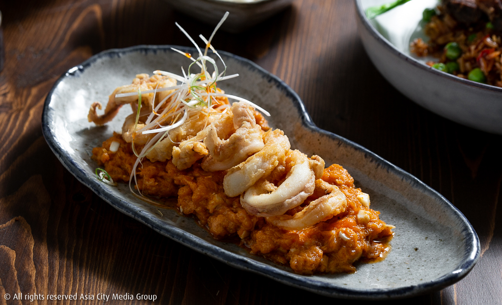 เริ่มจาก Five Spice Roasted Duck (320 บาท) เป็ดย่างโอ่งมังกรที่ผ่านขั้นตอน confit มาก่อนจนเนื้อนุ่มหนังกรอบ พร้อมกลิ่นหอมของเครื่องยาจีนทั้ง 5 ตามสูตรพะโล้แบบจีนที่ถูกต้อง พร้อมอีกเมนูหลักที่ควรสั่งอย่าง Golden Calamari (240 บาท) หมึกทองคำซอสไข่เค็มที่ทวิสต์มาจากปลาหมึกผัดไข่เค็มธรรมดา แต่แต่งเติมความแฟนซีลงไปด้วยการทำชุบแป้งทอดปลาหมึกให้เป็นคาลามารีมันซะเลย