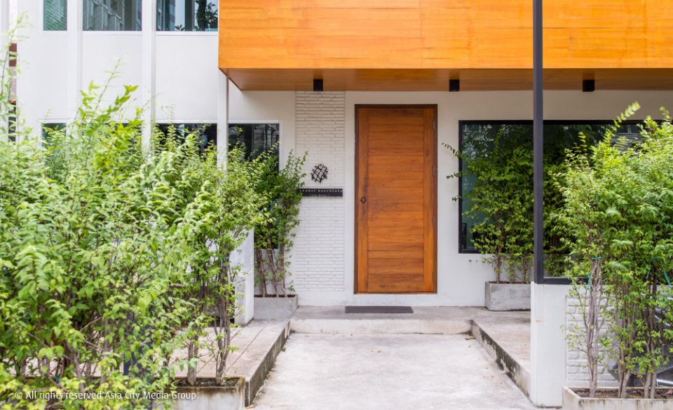Ekkamai Macchiato ที่เราเห็นตอนนี้คือบ้านสีขาวสองชั้น ด้านนอกมีมุมเก้าอี้สวนเล็กๆ รายล้อมด้วยรั้วต้นไม้สีเขียวสดชื่น ประตูไม้สีน้ำตาลเชื้อเชิญให้เปิดเข้าไปทักทาย