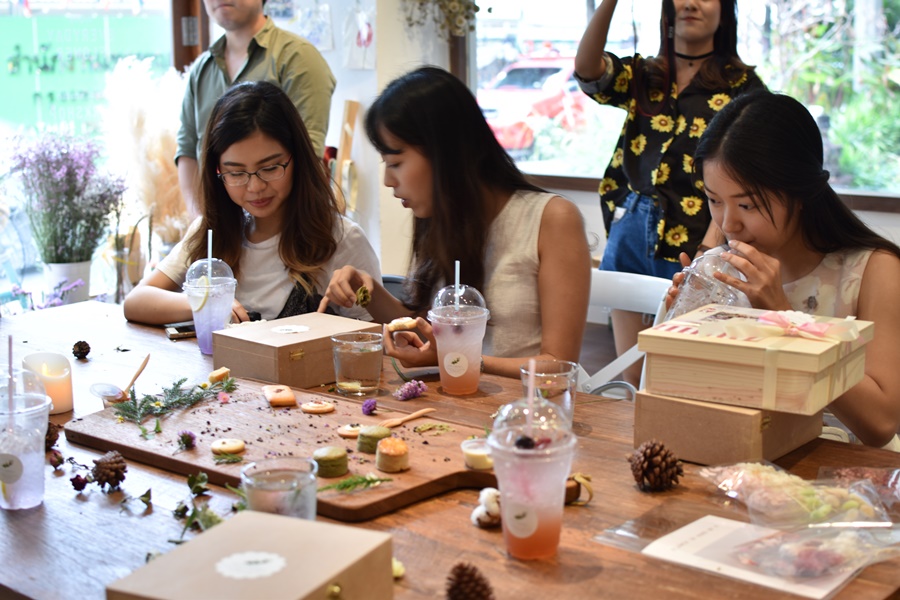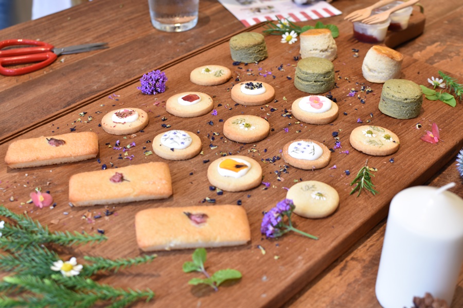 บรรดาคุ้กกี้ที่แต่งหน้าด้วยดอกไม้ต่างๆ อาทิ คาโมไมล์และเวอบีน่า (30 บาท) กับอีกอย่างที่เราขอยกให้เป็นหนึ่งในดวงใจคือ Financier (40 บาท) ขนมอบนุ่มละมุนในเวอร์ชั่นฝรั่งเศสที่ตกแต่งด้วยดอกไม้ทานได้เช่นกัน