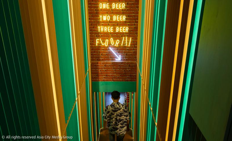 ทางเข้าลึกลับมาพร้อมทางเดินแคบ ๆ และบันไดเล็ก ๆ ที่ต้องใช้ความพยายามในการสังเกตหานิดหน่อย แต่ถ้าปักหมุดไว้ที่ก๋วยจั๊บนายเอ็ก หรือร้านเด็กสมบูรณ์ก็จะหาได้ไม่ยาก ความเซอร์ไพรส์อยู่ตรงพื้นที่บนชั้น 2 ที่ต้อนรับเราด้วยป้ายไฟนีออนดัดที่ได้แรงบันดาลใจมาจากประโยคเด็ดเท่ ๆ ของอาม่าประจำบ้านหุ้นส่วนทั้งสาม และที่เราทึ่งมาก ๆ คือพื้นที่ใหญ่โตอลังการเกินเบอร์ของชั้นบนที่ไม่สามารถเดาได้จากทางขึ้นแคบ ๆ ตรงชั้นล่างเลย เราชอบความโอ่อ่าของห้องเพดานสูงตามสไตล์ตึกคนจีนโบราณย่านนี้มาก มีตกแต่งเพิ่มเติมด้วยวอลเปเปอร์ลายอิฐ และมุมดอกไม้แห้งเท่ ๆ ทำให้เหลาแห่งนี้ดูอายุลดลงไปหลายสิบปี
