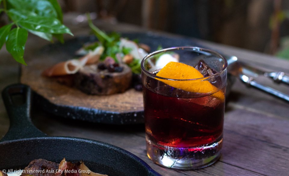 เมื่อเดินเข้ามาในร้านก็แทบลืมไปเลยว่าเราอยู่ในสุขุมวิท เพราะบรรยากาศด้านในชวนให้เราคิดถึงกระท่อมแถบชานเมืองในยุโรป เด่นชัดที่สุดคงหนีไม่พ้นบาร์ไม้สีเข้มที่ทอดตัวยาวขนานกับผนังฝั่งซ้ายของร้าน รวมถึงผนังกระเบื้องแผ่นใหญ่โทรน้ำตาลเข้ม อัดเพิ่มความสุขุมเข้าไปอีกขั้นด้วยเซ็ตติ้งไฟสีส้มทั่วร้าน ทั้งยังมีรูปปั้นสัตว์วางแอบซ่อนอยู่ทั่วร้าน ให้ความรู้สึกเหมือนมาเยี่ยมบ้านเพื่อนพ่อที่เป็นนายพรานล่าสัตว์สไตลด์ดิบ ๆ ห่าม ๆ ก็ไม่ปาน
