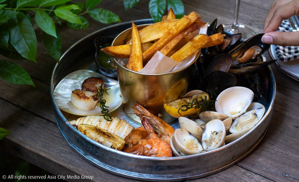 เราได้ลองชิมอาหารทั้งหมด 4 รายการด้วยกัน เริ่มจาก Grilled Seafood Platter (690 บาท) วัตถุดิบจากท้องทะเลกริลล์สุกพอดี ไม่ว่าจะเป็นกุ้ง หมึก บรรดาหอย Vongoles, Scallops และ Mussels เสิร์ฟพร้อมมันฝรั่งทอดเคล้ากับผงปาปริก้า และ Cocktail Sauce ใครโปรดปรานอาหารทะเลน่าจะฟินมาก แต่แนะนำให้พาเพื่อนไปกินด้วย เพราะพอร์ชันใหญ่ไม่ใช่เล่น ทางร้านแนะนำว่า ซิกเนเจอร์ค็อกเทล Passion Kiss (250 บาท) จิบคู่กันแล้วสดชื่น ล้างลิ้นสำหรับเมนูต่อไปได้ดีทีเดียว