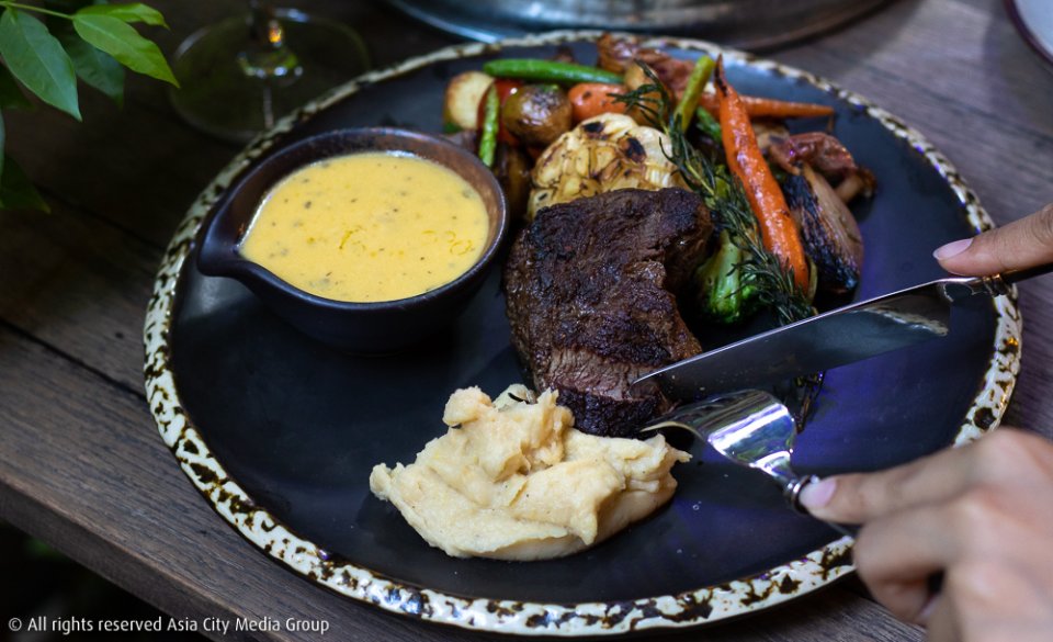 กินเล็ก ๆ น้อย ๆ กรุบกริบกันมามากแล้ว เราขอลงมือหม่ำหนัก ๆ ไปเลยกับ Beef Tenderloin with Bernaise (780 บาท) สเต๊กเทนเดอร์ลอยด์ชั้นดีจากออสเตรเลีย เคียงคู่มากับบรรดาผักย่าง (ที่เราฟาดหัวหอมหมดเกลี้ยง) มันบด และ Bearnaise Sauce จากเนย ไข่แดง น้ำส้มสายชูหมักจากไวน์ขาว และสมุนไพร มันเป็นคอมบิเนชันที่ดีมากอยู่แล้ว ยิ่งได้ไวน์แดงมาจิบด้วยแล้วยิ่งเริ่ด