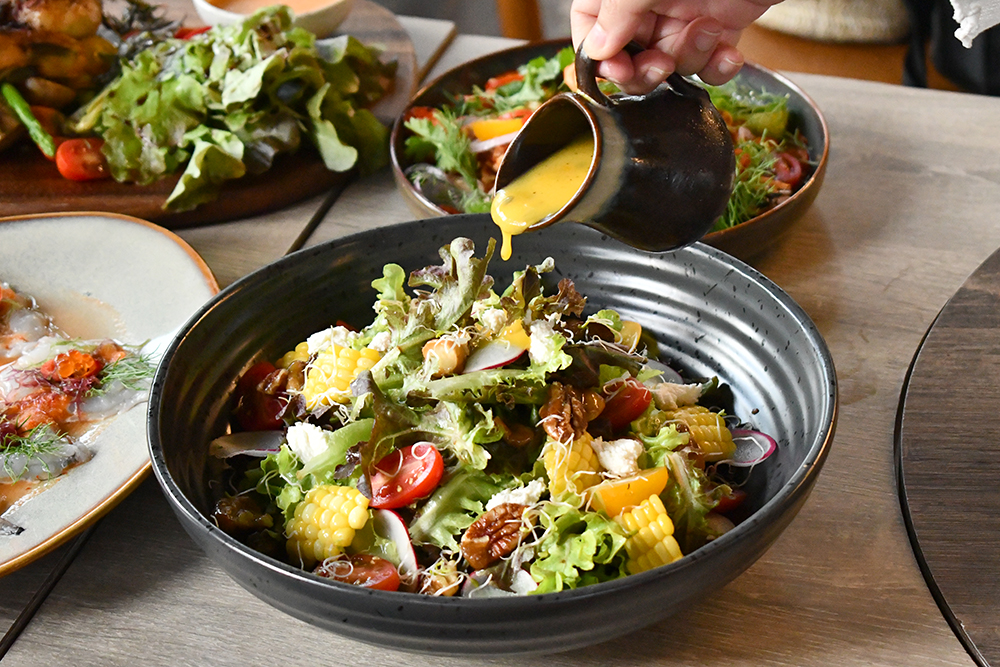 อีก 2 เมนูถัดมา คือจานที่เรารักแรงมาก ๆ นั่นคือ Khao Yai Salad (320 บาท) สลัดผักปลอดสารที่ได้มาจากฟาร์มเพื่อนบ้านรอบ ๆ เขาใหญ่ มีทีเด็ดคือน้ำสลัดรสเปรี้ยวอมหวานที่ทำมาจากเสาวรส และ Honey Barbecue Pork Ribs (450 บาท) ซี่โครงหมูรมควันที่เนื้อนุ่มจนหลุดออกจากกระดูกแบบแทบจะไม่ต้องใช้แรงดึง รสชาติหวานหอมกลมกล่อม พร้อมสลัดข้าวโพดที่เสิร์ฟเคียงกันมาเน้น ๆ