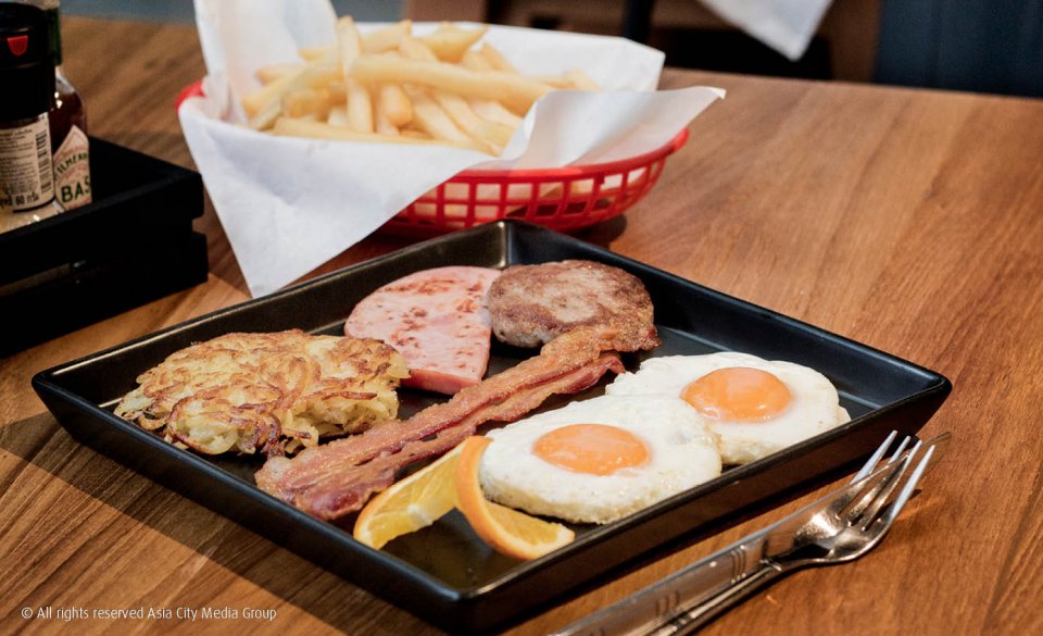 ความดีงามอีกอย่างคือร้านนี้เปิดตั้งแต่เช้าตรู่ มีชุดอาหารเช้าอย่าง Breakfast Sampler (295 บาท) ประกอบด้วยไข่ 2 ฟอง (ทอดหรือคน) เบคอน 2 ชิ้น ไส้กรอก 1 ชิ้น สเต็กแฮม 1 ชิ้น และแพนเค้ก 1 ชิ้น เราแนะนำให้สั่งแฮชบราวน์ (45 บาท) และถั่วอบในซอสมะเขือเทศ (45 บาท) มาเพิ่มด้วยก็ถือว่าครบเครื่อง ส่วนเครื่องดื่มก็มีทั้งกาแฟ น้ำผลไม้ และน้ำอัดลม (เริ่มต้น 35 บาท) ถือเป็นอีกทางเลือกสำหรับคนทำงานเช้านะ
