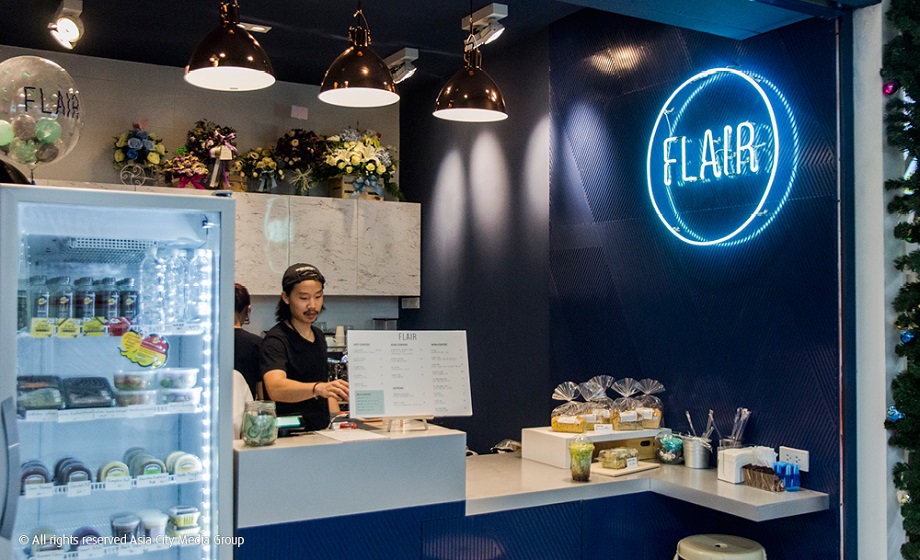 จากมุมเล็กๆ ในอาคารธนิยะ Flair ได้ขยับขยายสาขามาสู่อาคาร United Center แต่ก็ยังคงความเล็กกระทัดรัดเอาไว้ เหมาะสำหรับ Grab and Go แบบเร็วๆ เหมือนเดิม ที่เพิ่มเติมคือสีฟ้าหม่นๆ เหมือนน้อง Sadness ในการ์ตูนเรื่อง Inside Out และป้ายสีนีออนที่ถือว่าเป็นเอกลักษณ์ประจำร้านไปแล้ว