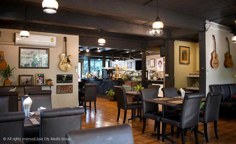 เราชอบการตกแต่งผนังด้วยรูปเพ้นต์ รูปถ่าย งานศิลปะ กีต้าร์ และของสะสมแบบแรนด้อม ทำให้รู้สึกว่าถึงจะเป็นอาหารไทยตำรับชาววังโบราณแท้ ๆ แต่ก็ไม่จำเป็นต้องใช้ผนังลายกนก ชามสังคโลก และเปิดเพลงลาวดวงเดือนอีกต่อไป