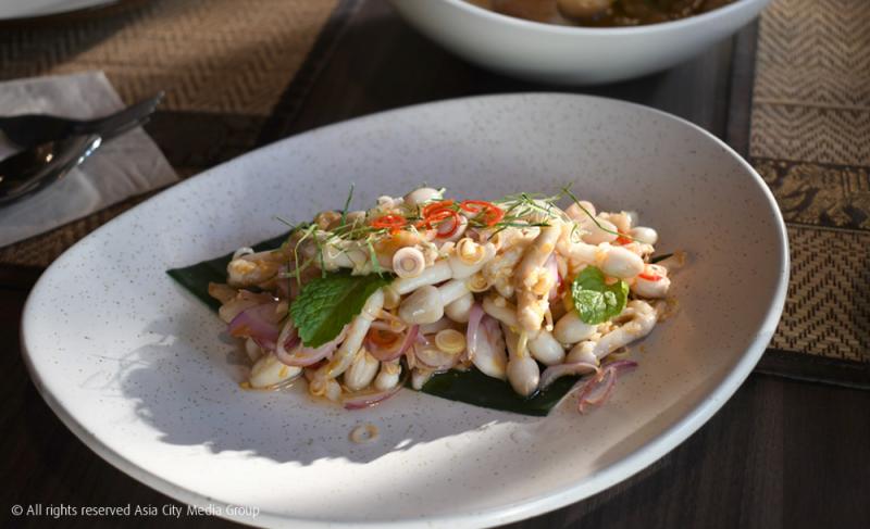 อย่างเช่นเมนู พล่าเห็ดโคนน้อย (260 บาท) จานนี้ที่เชฟภูมิเลือกใช้วัตถุดิบหลักเป็น 'เห็ดโคนน้อย' เห็ดถั่วที่เพาะพันธุ์เองจากฟาร์มออร์แกนิกในจังหวัดนนทบุรี ให้รสชาติเหมือนเห็ดโคนธรรมชาติ แต่ด้วยไซซ์ที่เล็กกว่าของตัวเห็ดทำให้เกิดความกรุบกรอบ เข้ากันกับน้ำยำเคล้ากลิ่นตะไคร้ ใบมะกรูด สาระแหน่ และพริกสดแบบครบเครื่อง ซึ่งเชฟบอกว่าความอร่อยอยู่ที่การยำพล่าให้สปอร์ใต้เห็ดไม่โดนกลบรสนั่นเอง