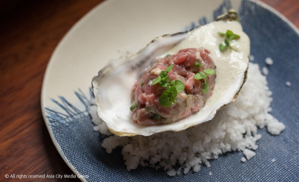อีกเมนูที่นำเสนอการผสมผสานระว่างทะเลและแผ่นดินได้เป็นอย่างดีคงหนีไม่พ้น Beef Tartare x Oysters (ชิ้นละ 250 บาท) ในรูปแบบของทาปาส เนื้อแองกัสบด คลุกเคล้ากับซอสพอนซึ (ponzu) เคียงด้วยมูสหอยนางรม และเสิร์ฟสวยงามบนเปลือกหอยนางรมราวกับไข่มุกสีชมพู