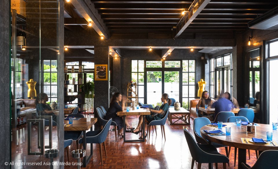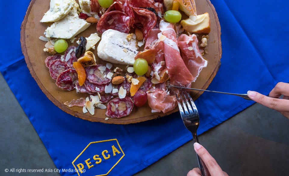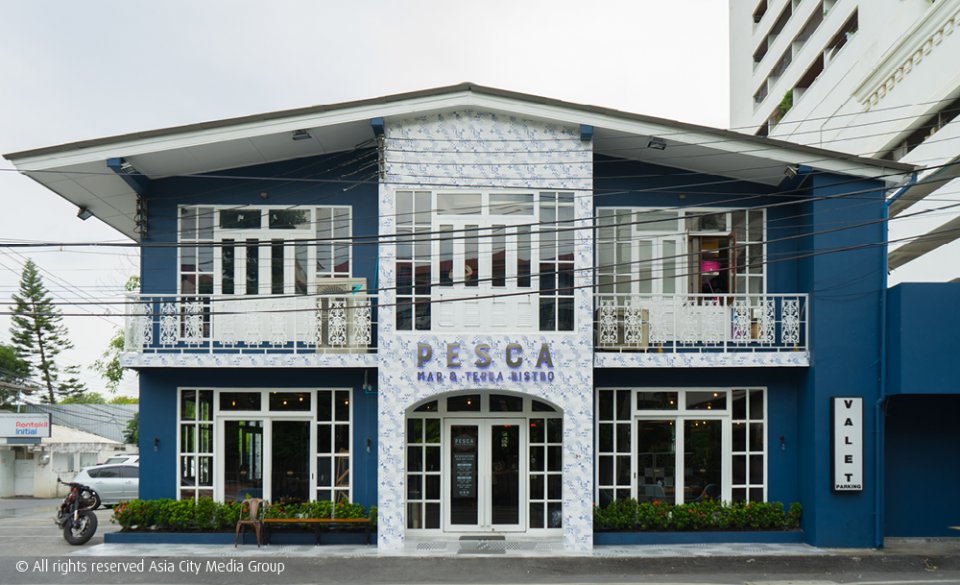Pesca ได้ใจเราตั้งแต่แรกพบ บ้านหลังใหญ่สีฟ้าครามที่ไม่ขรึมจนเกินไปเพราะตัดกระเบื้องสีขาวลวดลายสีน้ำเงิน เมื่อผลักประตูเข้าไปด้านใน เราจะได้สัมผัสบรรยากาศโมเดิร์นบิสโทร เสียงดนตรีสนุกๆ เร้าอารมณ์ ประกอบรวมเข้ากับบรรดาเฟอร์นิเจอร์ที่โดดเด่นแต่ไม่แย่งซีนกัน ทั้งเก้าอี้สีฟ้าคราม โต๊ะไม้ขัดเงาดูประณีต ไปจนถึงโซฟาบิ๊กเบิ้มสีน้ำตาลคาราเมลที่อยากทิ้งตัวใส่ให้รู้แล้วรู้รอด