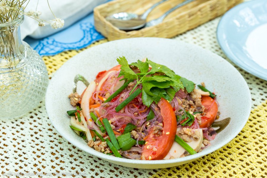 อีกเมนูไฮไลท์ที่ถือเป็นซิกเนเจอร์ของที่นี่เลยก็ว่าได้ ถึงขั้นเอาชื่อร้านมาตั้งเป็นชื่อเมนู คือข้าวกระเพราสำรับหมูสามชั้น (119 บาท) ความพีคคือใช้ข้าวหอมมะลิออร์แกนิคมาผัดกับใบกระเพรากรอบ ข้าวที่ได้เลยกลายเป็นข้าวสีเขียวหน้าตาดูมีอะไรไปอีก ! แนะนำให้สั่งมาทานคู่กับยำวุ้นเส้นบีทรูท (129 บาท) ที่เป็นสีชมพูสวยจากการใช้วุ้นเส้นต้มพร้อมน้ำบีทรูท วางคู่กันสองจานคือสีดีสุดอะไรสุด