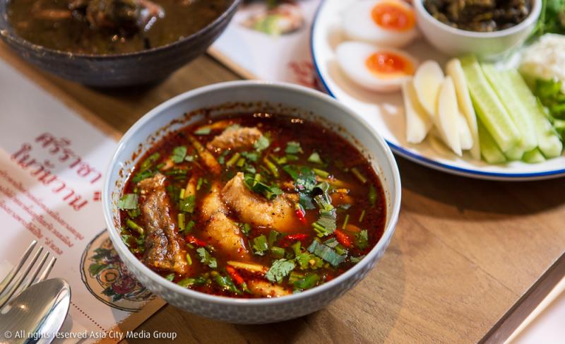 ต่อด้วยมัสยาลงสรง (280 บาท) อีกหนึ่งชามไฮไลท์ที่เกิดมาก็เพิ่งเคยได้ยินชื่อ แน่นอนว่านี่เป็นอีกหนึ่งสูตรลับที่ได้มาจากสมุดบันทึกของป้าแป๋ว ว่าด้วยการนำปลากระพงไปทอด ก่อนนำมาทำเป็นต้มยำรสจัดจ้าน หอมกลิ่นพริกแห้งคั่ว กะปิ และหอมแดง