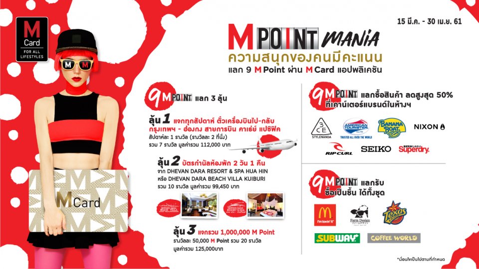 ช้าก่อน ก่อนที่จะหยิบปากกามาจดชื่อที่เที่ยวไปวางแผนทริป เราขอบอกว่าเรามีวิธีง่าย ๆ ที่จะลดค่าใช้จ่ายในการเที่ยวไปได้เยอะเลย ก็คือการเป็นสมาชิก M Card ที่มีสิทธิประโยชน์ต่าง ๆ มากมาย อย่าง point ที่นำมาแลกเป็นส่วนลดได้ แถมตอนนี้ เค้ากำลังมีโปรโมชั่นแลกคะแนน 9 point ผ่านแอปพลิเคชันเพื่อเอาไว้ลดราคาสินค้าสูงสุดถึง 50 % หรือจะใช้คะแนน 9 point ลุ้นโชคได้ถึง 3 ต่อ ต่อแรกคือตั๋วเครื่องบินไป-กลับฮ่องกง ต่อที่สองคือที่พักจาก Dhevan Dara Resort & Spa Hua Hin หรือ Dhevan Dara Beach Villa Kuiburi และต่อที่สามคือคะแนน 50,000 M Point