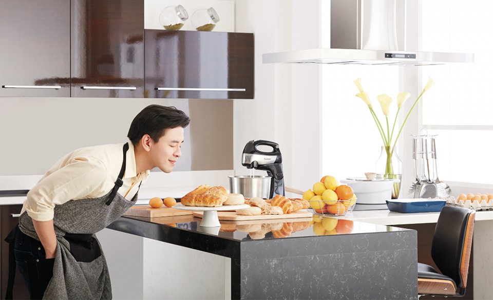 เดาไม่ยากใช่ไหมล่ะว่าเชฟนน จาก Brix Dessert Bar จะต้องให้ความสำคัญกับห้องครัวที่สุด แถมเชฟนนยังบอกว่าห้องครัวที่บ้านน่ะใหญ่กว่าห้องนอนอีก ! โดยเชฟนนจะเลือกเฟอร์นิเจอร์ที่ดีไซน์ถูกใจไว้เป็นโจทย์หลัก แล้วค่อยให้ช่างเข้ามาออกแบบพื้นที่ตามการใช้งาน ซึ่งเชฟนนเลือกใช้เฟอร์นิเจอร์จากหินอ่อนเป็นหลัก เพราะจะได้รักษาความเย็นของห้องตามแบบครัวทำขนมที่ดี อย่างโต๊ะและไอแลนด์ที่หน้าท็อปเป็นหินอ่อนทั้งหมด และเลือกใช้สีขาวเป็นหลักเพื่อให้ดูกว้างและสะอาดตา