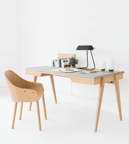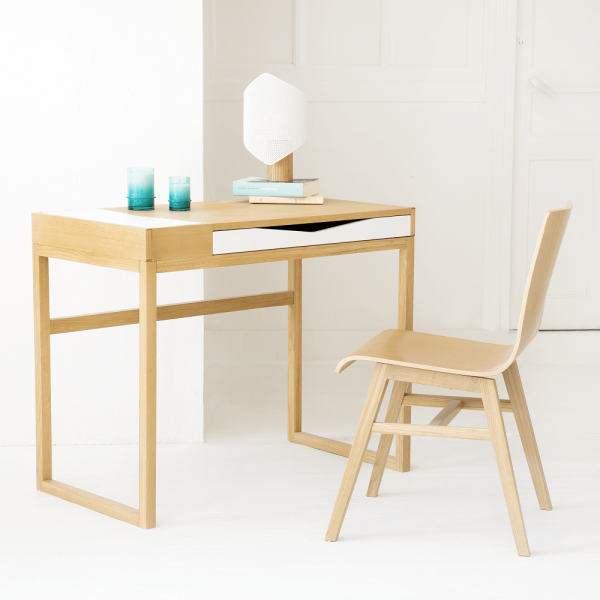 เราชอบโต๊ะไม้โอ๊ค Greta เพราะดีไซน์โดยรวมอันแสนมินิมอล โล่งโปร่ง มองทะลุได้ เหมาะสำหรับตั้งในห้องที่มีสเปซจำกัดแล้วดูไม่อึดอัด ความเก๋อีกอย่างคือช่องเล็กช่องน้อยของตัวเฟอร์นิเจอร์ อย่างช่องใส่ของทางด้านซ้ายมือ ลิ้นชักด้านหน้า และพื้นที่ใต้โต๊ะโล่งๆ ที่สามารถยัดเก้าอี้เก็บได้ทั้งตัวเพราะไม่มีขื่อใดๆ กั้นอยู่ จะติ๊งต่างเป็นโต๊ะคอมพิวเตอร์ก็ยังได้