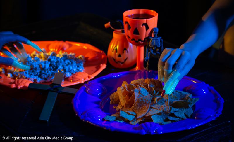 เราเชื่อว่ามีหลายคนที่เป็นแบบเรา คือเวลาดูหนังต้องมีของกินจุบจิบ ขนมขบเคี้ยว รวมถึงน้ำวางไว้ข้าง ๆ ด้วย จะได้ไม่ต้องลุกไปหยิบเวลารู้สึกเหงาปาก ดังนั้นคนช่างหิวทั้งหลายจงเริ่มจากการหากระบอกน้ำและแก้วน้ำหัวฟักทองใส่น้ำอัดลมไว้จิบระหว่างดูหนัง พร้อมจานพลาสติกสีม่วงและส้มไว้ใส่ป๊อบคอร์น และใช้เป็นของตกแต่งบ้านในช่วงเทศกาลปล่อยผีไปในตัวด้วยซะเลย
