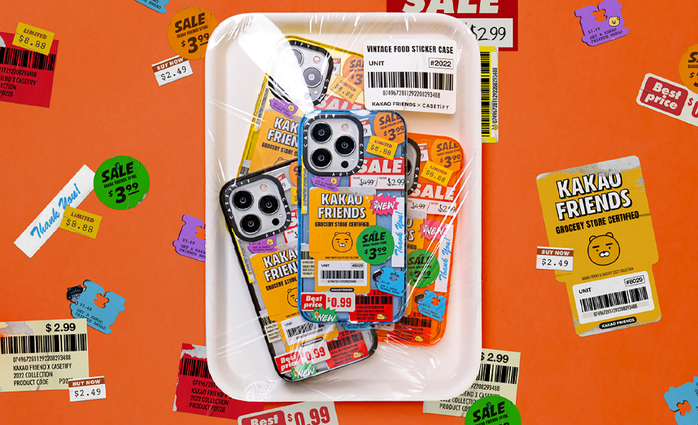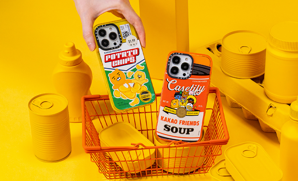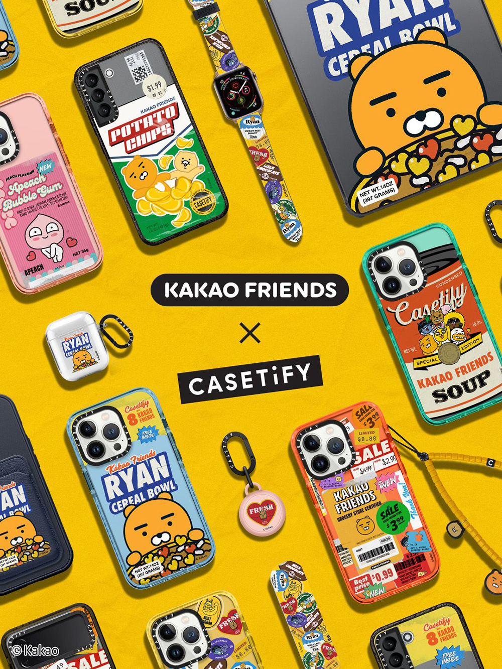 Casetify x Kakao Friends คอลเลกชันนี้มีจุดเด่นตรงที่เขาใสในธีมร้านขายของชำสไตล์วินเทจ บรรดาลวดลายในคอลเลกชันนี้จึงมีตั้งแต่รูปกล่องซีเรียล ซุปกระป๋อง หมากฝรั่ง ถุงมันฝรั่งทอด ฯลฯ ซึ่งล้วนเป็นสไตล์กราฟิกที่กำลังฮิตมาแรงในตอนนี้