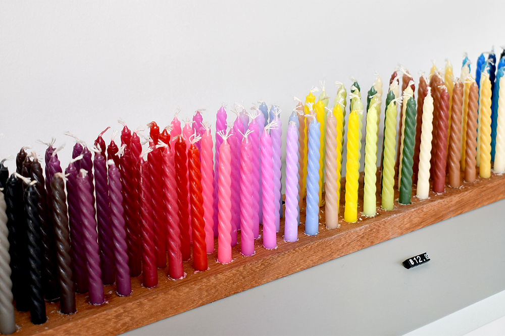 ที่ฝั่งหนึ่งของเคาน์เตอร์เรียบ ๆ เป็นที่ตั้งของสินค้าซิกเนเจอร์ของแบรนด์ ซึ่งนั่นก็คือเทียนวันเกิดทรงเกลียวที่ผลิตขึ้นมาจากแม่พิมพ์วินเทจอายุกว่า 40 ปี จากเยอรมนี โดยจะถูกจัดวางในกล่องไว้อย่างเป็นระเบียบ แยกให้เห็นเป็นเฉดสีพิเศษมากถึง 24 สี ไล่มาตั้งแต่สีโมโนโทนเท่ ๆ อย่าง ดำ น้ำตาลเข้ม น้ำตาลอ่อน เทา และสีแปลก ๆ ที่ไม่ค่อยเห็นคนหยิบมาทำเป็นเทียนวันเกิด อาทิ เขียวมะนาว ม่วงพาสเทล ฟ้าน้ำทะเล และสีครีม ตามคอนเซปต์ของเจ้าของแบรนด์ ที่บอกว่า 'ถ้าซื้อเค้กสวยแล้ว เทียนก็ต้องสวยด้วย!' จุด ๆ นี้จะซื้อเป็นเล่ม (เล่มละ 12 บาท) หรือซื้อเป็นกล่อง 10 เล่ม (กล่องละ 115 บาท) โดยเลือกเฉพาะสีที่เราชอบก็ได้เหมือนกัน