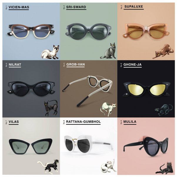 แบรนด์ไหนๆ ก็มีแว่นตาทรงแคทอาย แต่ Arty&Fern Eyewear สองดีไซเนอร์ผู้ออกแบบแว่นเฉพาะบุคคล ได้เพิ่มกิมมิคสนุกสนานลงไปบนแว่นตาทรงนี้ผ่านเรื่องราว "แมวไทยมงคล" ตำนานที่อยู่คู่กับวิถีชีวิตคนไทยมาหลายต่อหลายสมัย เป็นการผสมผสานความเชื่อโบราณกับแฟชั่นยุคใหม่อย่างลงตัว โดยแว่นมีทั้งหมด 9 แบบ สีสันขึ้นอยู่กับเอกลักษณ์ของแมวแต่ละสายพันธุ์ ได้แก่ สีสวาด วิเชียรมาศ ศุภลักษณ์ นิลรัตน์ โกญจา กรอบแว่น วิลาศ รัตนกำพล และมุลิลา เราขอปรบมือให้ความคิดดีๆ ไอเดียเก๋ๆ ที่ไม่เกร่อและไม่ซ้ำใครจริงๆ
