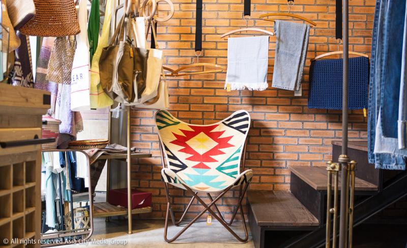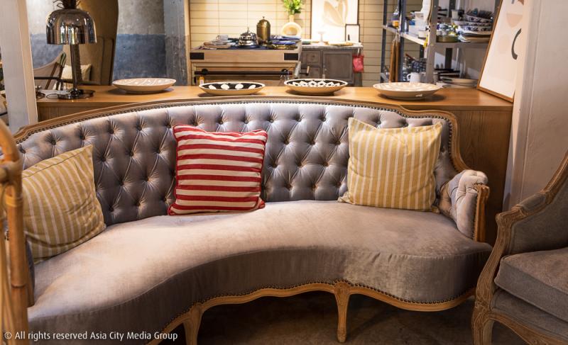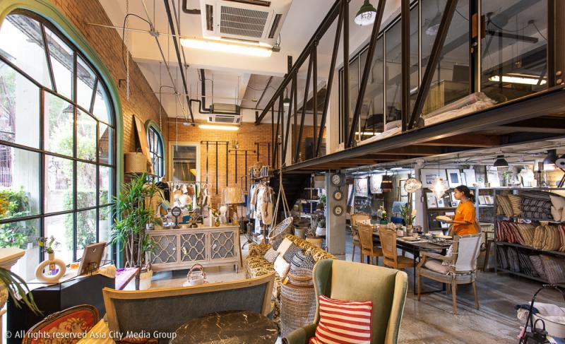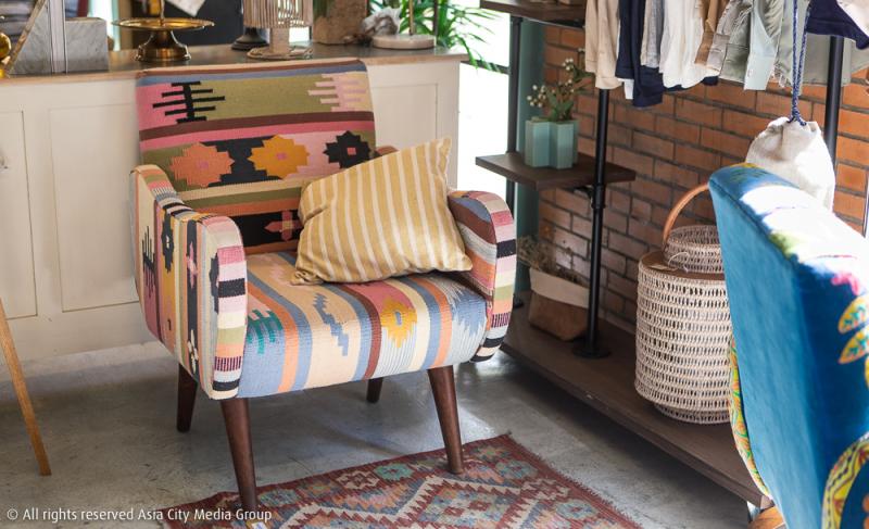 เฟอร์นิเจอร์ชิ้นใหญ่หลายชิ้นถูกซีเลกมาจากอินเดีย จีน อัฟกานิสถาน ทวีปแอฟริกา ยันเมืองสุดชิคอย่างบาหลี รวมถึงของสะสมจากแก๊งเจ้าของร้าน ถูกนำมาวางในร้านกึ่งโชว์รูมแห่งนี้ให้ลูกค้าอย่างเราได้ทดลองนั่ง ลูบคลำ และจับจองเป็นเจ้าของ ซึ่งแน่นอนว่าก่อนจะเอามาวางขาย ร้านนี้เขามีการบุผ้าใหม่สำหรับเก้าอี้และโซฟาที่เก่าเกินเยียวยา เพื่อสภาพดูดีใสกิ๊งจนนึกว่าเป็นของใหม่มือหนึ่ง พรมจากอินเดียและประเทศตะวันออกกลางหายากหลายผืนถูกทำความสะอาดด้วยวิธีที่ถูกต้องเพื่อความไฮจีนิกถูกแขวนวางเรียงรายให้เราเลือกซื้อกลับไปตกแต่งบ้าน