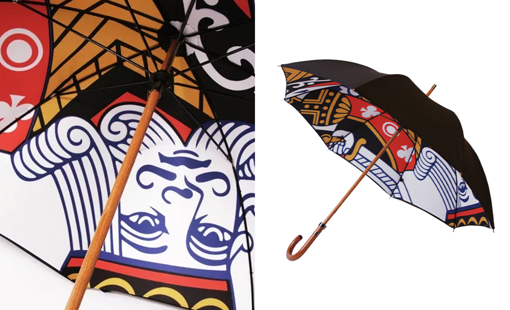 ดีไซน์นี้เรียกได้ว่าเตะตาเราอย่างแรงตั้งแต่แรกเห็น กับร่มลาย King of Clubs หรือ คิงดอกจิก ที่แทบจะวาดไพ่ทั้งใบไว้ใต้ร่ม ซึ่งความชิคของคอลเลกชันร่มพรีเมียมของที่นี่อยู่ที่การเป็นร่ม Double Layer คือมีผ้าใบ 2 ชั้น ด้านนอกเป็นสีดำเรียบ ๆ ส่วนด้านในพิมพ์อีกลายหนึ่ง ซึ่งลายไพ่ที่มีสีดำ แดง เหลือง เป็นหลักแบบนี้ ยิ่งขับเน้นกิมมิกการซ่อนลายผ้าอีกลายไว้ด้านในให้โดดเด่นยิ่งขึ้น