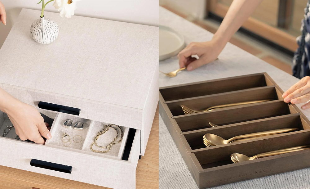 The Container Store x KonMari ประกอบด้วยไอเทมตัวช่วยในการจัดเก็บบ้านต่าง ๆ กว่า 100 ชิ้น ไม่ว่าจะเป็นไม้แขวนเสื้อ, อุปกรณ์จัดเก็บของในลิ้นชัก, ถาด, กล่อง และบรรดากระปุกสำหรับเก็บเครื่องปรุงจุ๊กจิ๊กในห้องครัว หรือจะดัดแปลงเป็นกระปุกเก็บของบนโต๊ะเครื่องแป้งหรือโต๊ะทำงานก็ได้
