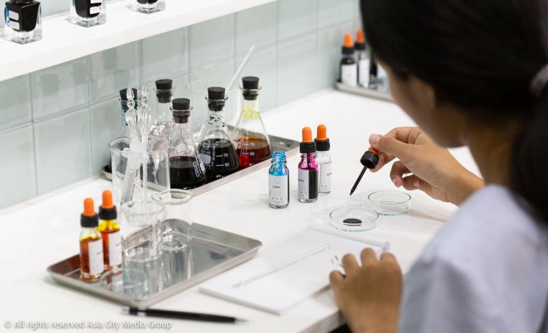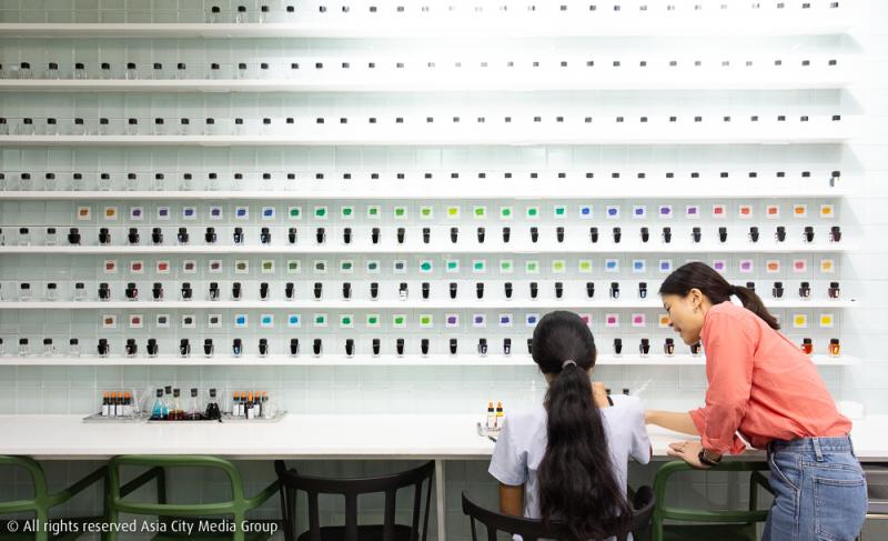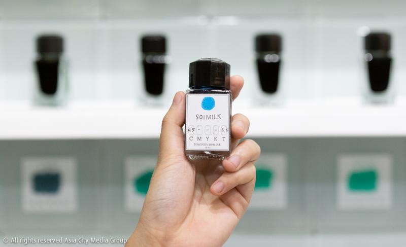 และที่สะดุดตาสะดุดใจเรามากที่สุดก็คือ Ink Bar นั่นเอง ฟังก์ชันนี้อาจจะใหม่สำหรับคนไทยซักหน่อย แต่น่าลองมากบอกเลย เพราะบาร์นี้จะให้เรามาลองผสมสีหมึกตามความชอบเองกับมือ โดยจะมีตัวอย่างและสูตรสีวางอยู่บนกำแพง พร้อมอุปกรณ์ที่เหมือนอยู่ในห้องทดลอง และความพรีเมียมจะอยู่ตรงหมึกที่นำมาผสมนั้นเป็นหมึกนำเข้า โดยเขาคัดมาแล้วว่าผสมกันได้หลากเชดสีแน่นอน ใช้เวลาผสม 5-40 นาทีตามความพิถีพิถันของแต่ละคน ก็สามารถตั้งชื่อสีเองแล้วใส่กล่องกลับบ้านได้เลยในราคา 500 บาท