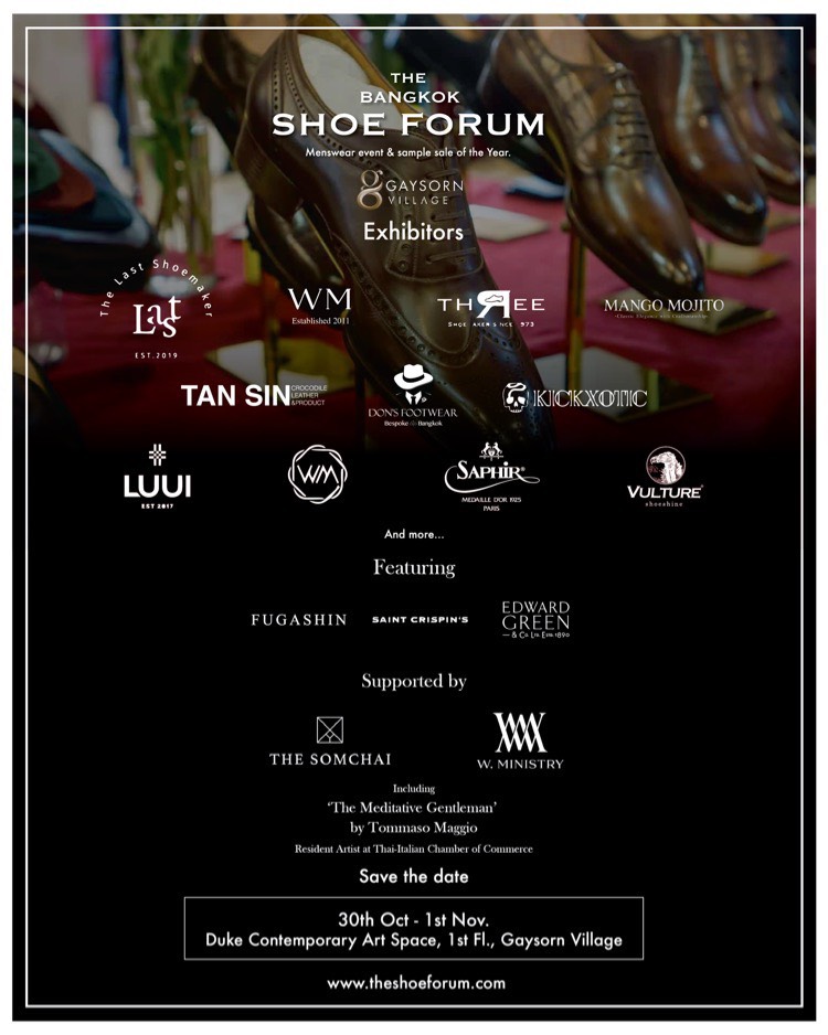 The Bangkok Shoe Forum ถือเป็นงานสำหรับคนรักรองเท้า (โดยเฉพาะรองเท้าหนัง) ที่หนึ่งปีจะมีสักครั้ง แถมยังมีแค่วันเดียวเท่านั้น! ซึ่งไฮไลต์คือการรวบรวมเอาแบรนด์รองเท้าชั้นนำที่เปี่ยมด้วยจิตวิญญาณแห่งความคลาสสิก อาทิ THE LAST SHOEMAKER, W.MINISTRY, THE SOMCHAI, WINSTON MAISON, THREE, MANGO MOJITO, TAN SIN, DON’S FOOTWEAR, KICKXOTIC, LUUI, SAPHIR, VULTURE, FUGASHIN, SAINT CRISPIN’S และ EDWARD GREEN ที่จะขนไอเทมหายากของแบรนด์ตัวเองมาอวดโฉมให้ได้ลองใส่และจับจองเป็นเจ้าของกันแบบแน่น ๆ