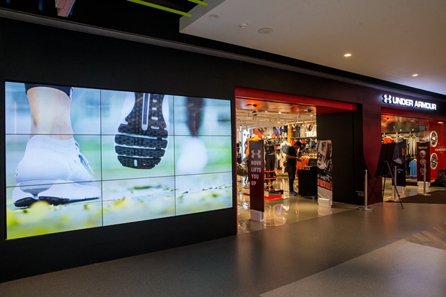 จากที่เราแวะเวียนไปดูมาด้วยตาตัวเองแล้ว สิ่งแรกเลยคือสาขาที่ 11 ของ UA นี่น่าจะเป็นสาขาที่มีของครบครันที่สุดแล้วอีกสาขาหนึ่ง ด้วยความใหญ่โตของร้าน (แต่ก็ยังไม่ใหญ่ที่สุด เพราะเล็กกว่าสาขาสยามเซ็นเตอร์) เลยทำให้มีไลน์ผลิตภัณฑ์ครบตั้งแต่เสื้อผ้า รองเท้า และเครื่องแต่งกายต่าง ๆ เช่น หมวก กระเป๋า ถุงมือ ฯลฯ ส่วนสิ่งที่ว่าล้ำสมัยนั้นเรามองเห็นอย่างเป็นรูปธรรมเพียงจอขนาดใหญ่ที่ตั้งอยู่ด้านหน้าของร้าน ที่ให้พวกเราสามารถทดสอบการวิ่งได้อย่างเสมือนจริง ผ่านสิ่งกีดขวางบนจอตรงหน้า และต้องวิ่งเพื่อทำความเร็วสูงสุด โดยระบบสามารถวัดความเร็วของเราเมื่อวิ่งเข้าถึงเส้นชัยได้ด้วย ได้ข่าวว่าจอระบบ running active นี่ไม่ได้ตั้งอยู่อย่างถาวรนะ ใครอยากลองก็คงต้องรีบแวะไปหน่อย เห็นว่าใครวิ่งได้เร็วที่สุด จะได้รางวัลเป็นแพ็กเกจไปมาราธอนที่สิงคโปร์เลยด้วย
