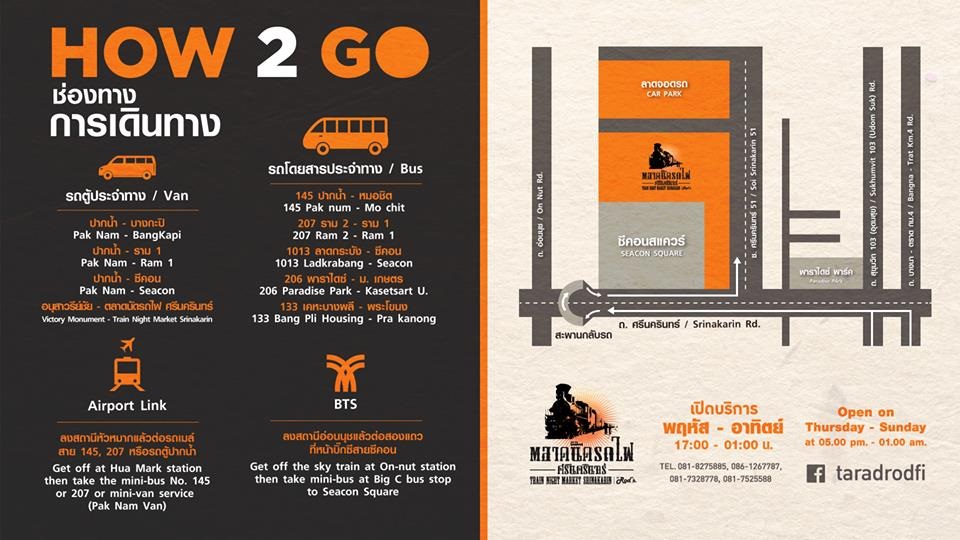 สถานี BTS ที่ใกล้ที่สุดคือ อ่อนนุช (ต่อรถบัสจาก Big C ไปซีค่อนแสควร์) หรือ Airport Link สถานีหัวหมาก เราแนะนำให้นั่งแท็กซี่ไป แต่ถ้าอยากขับรถส่วนตัวไปเองควรรีบไปก่อน 6 โมงเย็น ไม่งั้นที่จอดรถจะเต็ม แถมรถติดด้วยเพราะทางเข้า-ออกมีถนนอยู่เส้นเดียว