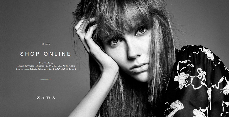 ถ้าเข้าไปเยี่ยมหน้าเว็บ Zara ประเทศไทยตอนนี้จะเห็นแบนเนอร์ขนาดใหญ่สำหรับร้านค้าออนไลน์ที่กำลังจะเปิดตัวสิ้นเดือนนี้ แต่ยังไม่สามารถคลิกหรือทำอะไรได้ทั้งสิ้นนะ ต้องอดใจรอนิดนึง เราเชื่อว่าต้องมีเสื้อผ้า เครื่องประดับ และไอเทมแฟชันต่างๆ นานาไม่แพ้เว็บแม่ที่สเปนเลยแหละ