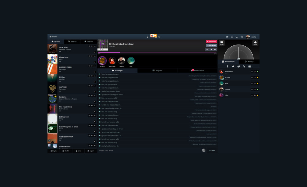 แต่ถ้าใครอยากฟังเพลงกันเองในกลุ่มเพื่อน ก็ไปตั้งห้องของตัวเอง แล้วกดปุ่ม Be a DJ เพื่อรับบทเป็นดีเจกันได้เลย โดยเราสามารถตั้งเพลงที่อยากเปิดได้ที่ส่วน Queue แล้วเพลงจะรันไปตามลำดับที่เรากำหนดไว้ ซึ่งความเจ๋งอีกอย่างหนึ่งของแอปฯ นี้ก็คือ เราสามารถกดเข้าสู่ History เพื่อดูรายการเพลงที่เปิดในห้องนี้ย้อนหลังได้ และถ้าเราชอบเพลงไหน สามารถกดติดดาวไว้ แล้วเพลงนั้นก็จะไปอยู่ในเพลย์ลิสต์ใน Spotify ของเราโดยอัตโนมัติ อยากกลับมาฟังเมื่อไหร่ก็ได้