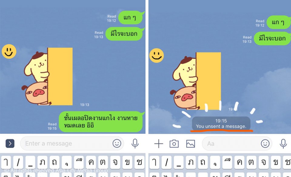 หลังจากที่เราลองใช้ พบว่าการลบนั้นแสนจะสะดวก แค่กดข้อความที่อยากจะลบค้างไว้ จากนั้นกด "Unsend" แอพพลิเคชั่นก็จะลบข้อความออกไปโดยอัตโนมัติจากทั้งแชทของฝั่งเรา และของฝั่งผู้สนทนา เหลือแค่ข้อความขึ้นว่า "You unsent a message." เท่านั้น