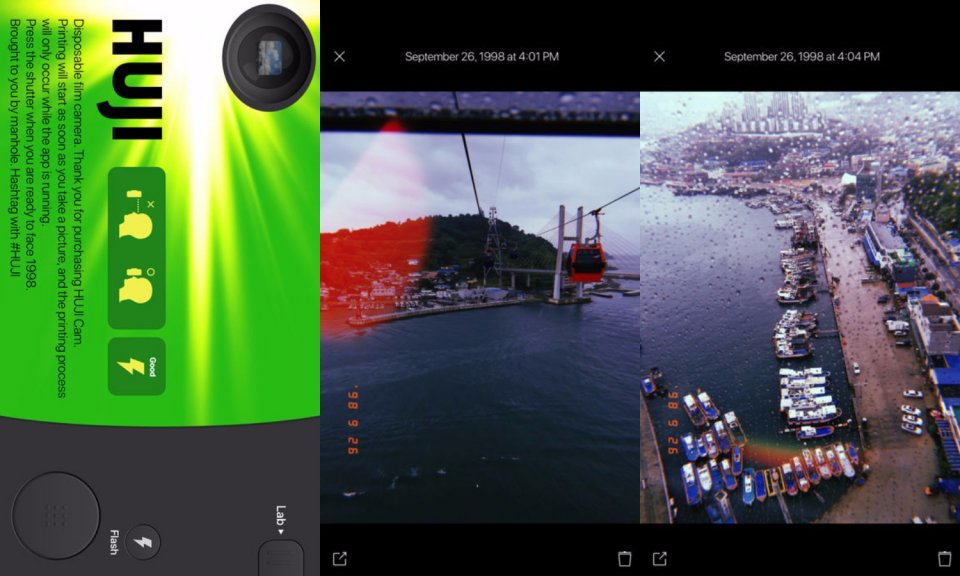 แอปพลิเคชันถ่ายภาพจากดีเวลลอปเปอร์ชาวญี่ปุ่นที่มีคอนเซปต์สุดแข็งแรงอย่าง “เหมือนกลับไปถ่ายด้วยกล้องใช้แล้วทิ้งในปี 1998” แค่ชื่อแอปก็รู้แล้วว่าโทนภาพจะออกมาคล้ายกับฟิล์มยี่ห้ออะไร ทั้งอุณหภูมิสีและความชัดของภาพนี่ได้อารมณ์จริง ๆ แถมยังไม่ต้องรอเวลาล้างฟิล์มอีกด้วย ถ่ายปุ๊บ สามารถเข้าไปดูภาพทั้งหมดที่ถ่ายในแอปได้เลย ชอบภาพไหนก็เลือกบันทึกลงในอัลบั้มรูปบนสมาร์ทโฟน Huji Cam ยังมีลูกเล่นสนุก ๆ ที่ดีไซน์หน้าตาให้เหมือนกล้องใช้แล้วทิ้ง ต้องเอาตาของเราไปวางใกล้ ๆ วิวไฟน์เดอร์เหมือนกับกำลังจะถ่ายกล้องฟิล์มจริง ๆ วิวไฟน์เดอร์ถึงจะขยายใหญ่เต็มจอให้ เท่สุด ๆ