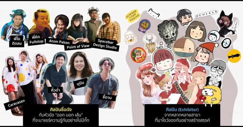 โดยงานออกนอกเส้นนี้เขาก็มีที่มาที่ไปนะ โดยมาจากประโยคสมัยเด็ก ๆ เวลาเราระบายสีก็มักจะถูกบอกว่า อย่าระบายออกนอกเส้นนะ ทางผู้จัดจึงหยิบคำ ๆ นี้มาใช้เป็นชื่อของเทศกาล ชวนให้ผู้มาร่วมงานมาแสดงออก มาทำอะไรที่ชอบ นอกพื้นที่ของตนเอง โดยใช้ลายเส้นและสีสันของตนเองเป็นสื่อกลางการสื่อสารความคิดสร้างสรรค์และการแสดงตัวตน ทุกคนจะได้มาร่วมแสดงความคิดเห็นโดยไม่จำกัดอาชีพ ซึ่งผู้จัดได้รวบรวมผู้คนจากหลากหลายสาขาอาชีพตั้งแต่ นักวาด นักเขียน ศิลปิน ครีเอทีฟ สำนักพิมพ์ และเหล่าเซียนประจำสื่อออนไลน์ เรียกได้ว่า ออกนอกเส้น ที่แท้จริง