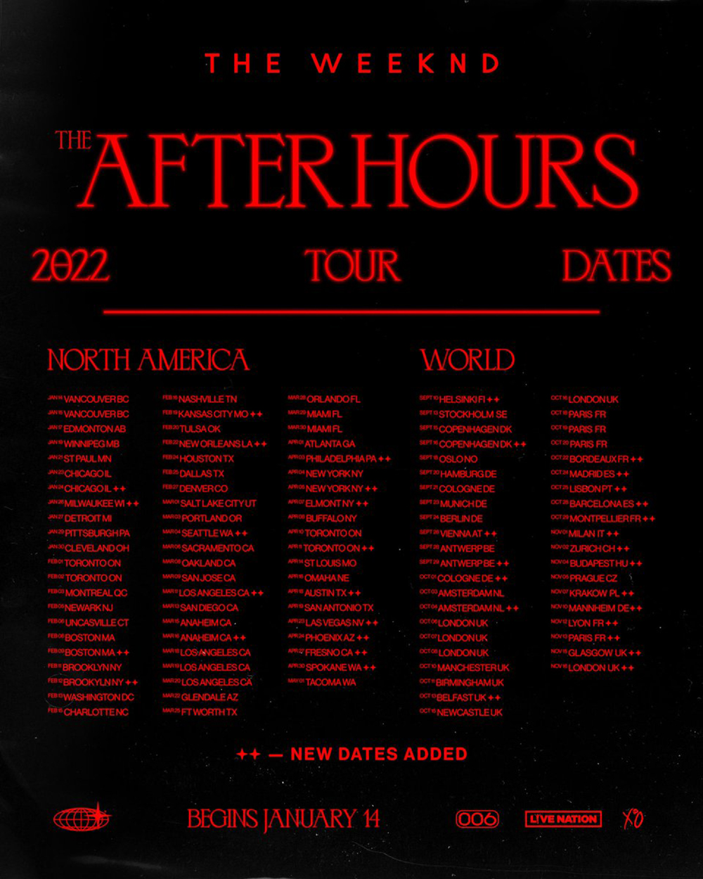 ที่จริง After Hours World Tour ควรจะออกตระเวนเดินทางไปพบปะกับแฟน ๆ ทั่วโลกตั้งแต่เมื่อปีที่แล้ว แต่เนื่องด้วยสถานการณ์ COVID-19 ที่ยังไม่มีทีท่าว่าจะคลี่คลาย After Hours World Tour จึงจำเป็นต้องเลื่อนออกไป ซึ่งเมื่อไม่กี่วันที่ผ่านมา เว็บไซต์ของ The Weeknd ก็เพิ่งเผยตารางวันและสถานที่ที่ทัวร์นี้จะไปเยือนออกมาแล้ว โดยจะเริ่มโหมโรงที่แรกที่แวนคูเวอร์ ประเทศแคนาดา ตั้งแต่กลางเดือน ม.ค. 2022 และจะสนุกกันยาว ๆ ไปจนถึงสิ้นปี