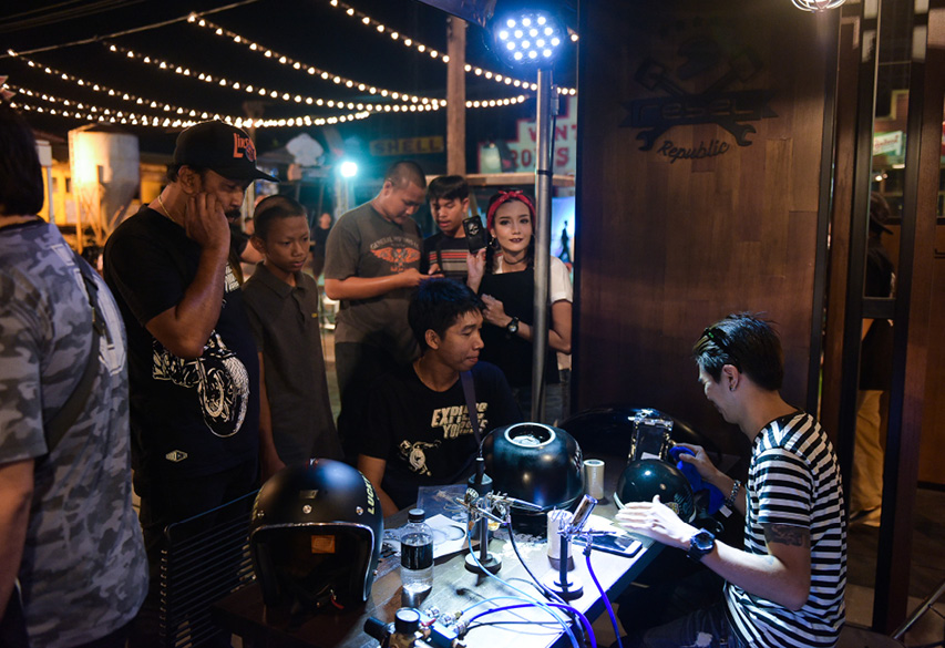 นอกจากมอเตอร์ไซค์คัสตอมสวยๆ และกาแฟรสเยี่ยมแล้ว ในงานยังมีโซนศิลปะที่เปิดโอกาสให้คนที่ชื่นชอบและอยากแสดงตัวตนในแบบของตัวเองออกมาในงานอาร์ตด้วย จิบกาแฟไนโตรเสร็จแล้วอย่าลืมแวะไปที่โซน Custom Paint ที่มีเหล่าศิลปินสตรีทอาร์ทจะมาสร้างสรรค์งานคัสตอมลงบน accessory ต่างๆ ของมอเตอร์ไซค์ให้เราดูกันสดๆ ด้วย