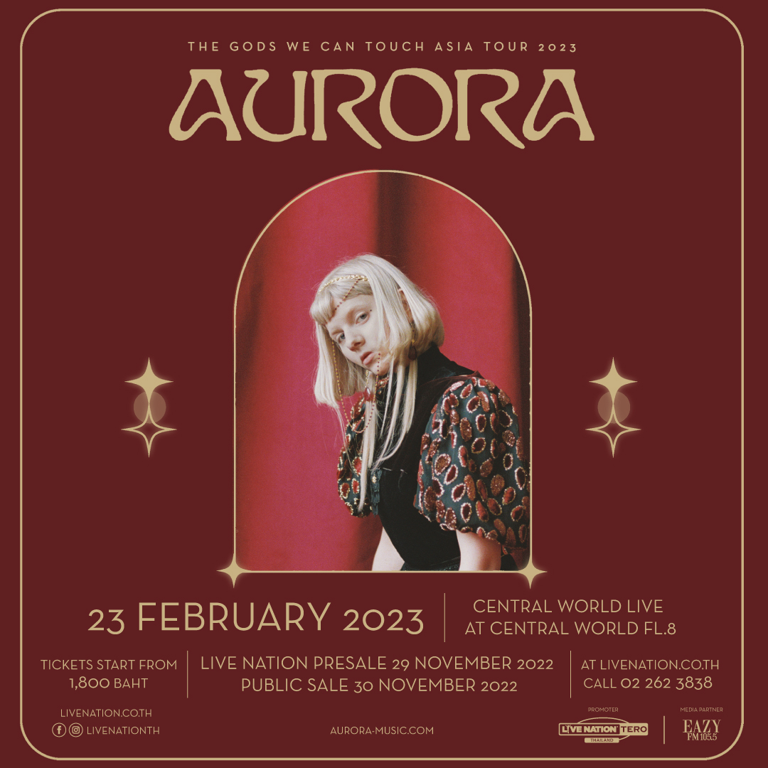 บัตรคอนเสิร์ต AURORA 'The Gods We Can Touch Tour' วางขายรอบพรีเซลสำหรับสมาชิก Live Nation Tero วันที่ 29 พ.ย. นี้ และสำหรับลูกค้าทั่วไป วันที่ 30 พ.ย. ทาง livenation.co.th โดยโชว์นี้จะแสดงในวันที่ 23 ก.พ. 2023 ที่ CentralWorld Live ชั้น 8 CentralWorld ใครที่ไม่อยากพลาดโชว์แรร์ ๆ ที่นานทีปีหนจะมีครั้ง จงตั้งนาฬิกาปลุกเตรียมรอกดบัตรสิ้นเดือนนี้หลังเงินเดือนออกได้เลย!