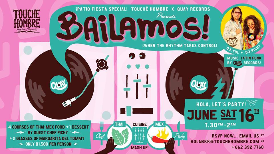 ไปกินอาหารไทยสไตล์เม็กซิกันใจกลางกรุงเทพฯ กัน ซื้อบัตรทีเดียวได้คอร์สอาหารถึงสี่อย่างพร้อมของหวานและมาการิต้าสองแก้ว คุ้มกว่านี้ไม่มีแล้ว อิ่มแล้วก็ย่อยด้วยการแดนซ์กับเพลงจากดีเจตุล ไวทูรเกียรติ วงอพาร์ตเมนต์คุณป้าและ Quay Records งานเดียวทั้งอิ่มทั้งมันส์
