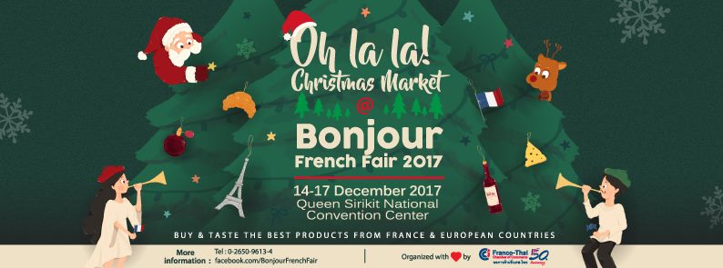 นอกจากตลาดนัดเยอรมันเมื่อสัปดาห์ที่แล้ว อาทิตย์นี้เรายังมีตลาดฝรั่งเศสที่จัดต่อเนื่องมาเป็นปีที่ 15 กับงานมหกรรมสินค้าฝรั่งเศสที่ใหญ่ที่สุดของประเทศไทย ที่มาพร้อมกับสารพัดเมนูอาหารแบบ Original French รวมไปถึงสินค้าจากฝรั่งเศสและหลากหลายประเทศในยุโรปที่มาร่วมออกบูธมากกว่า 90 บูทจากทั้งผู้ผลิตและผู้นำเข้าชั้นนำ แถมครั้งนี้ยังมาในธีม "Oh La La! Christmas Market" อีกต่างหาก รับรองว่าบรรยากาศจะทำให้คุณเหมือนหลุดไปอยู่ในตลาดคริสต์มาสจากเมืองใจกลางยุโรปเลยล่ะ