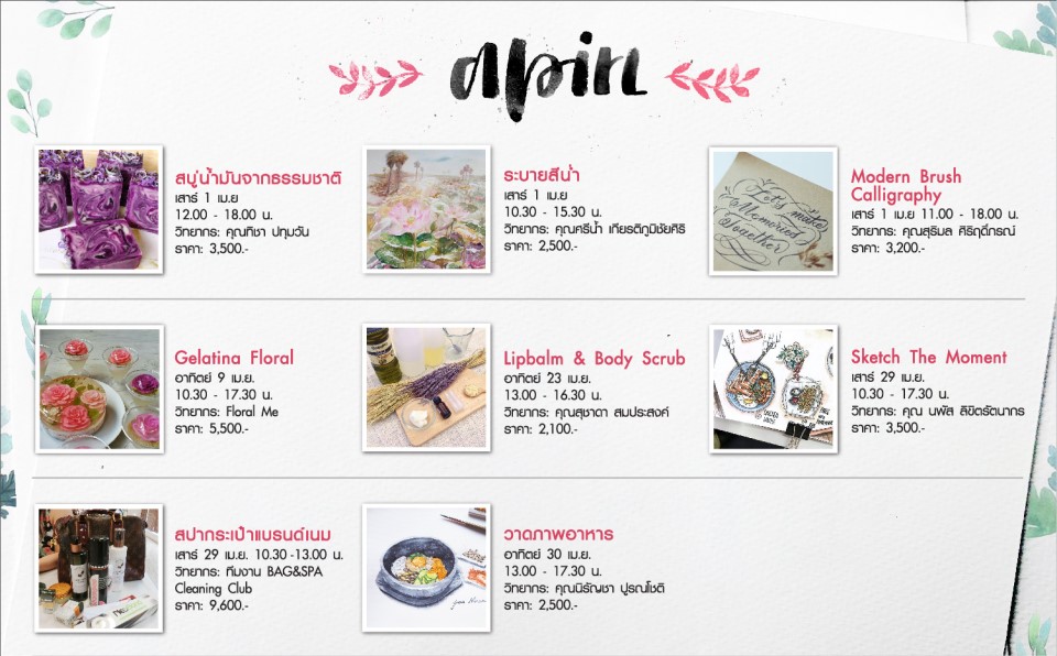 ราคา: 2,100 บาท (รวมอุปกรณ์และของว่าง - เครื่องดื่ม)