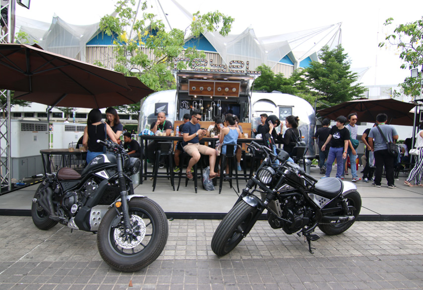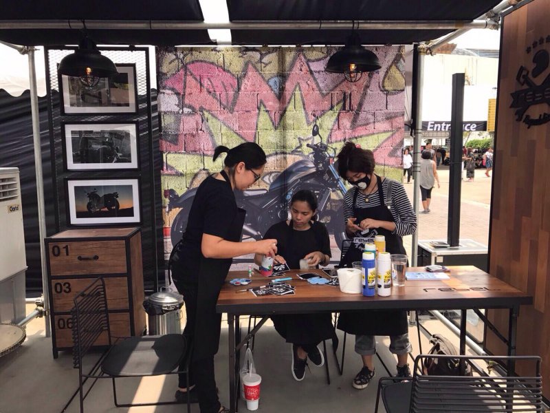 ส่วนใครอยากดีไอวายด้วยตนเอง เค้ามีเวิร์คช็อป Airbrush ให้เราได้พ่นสีวาดลวดลายคูลๆ และใส่ความคิดสร้างสรรค์ลงไปได้เต็มที่ เสร็จแล้วแวะไปฟังทอล์คสร้างแรงบันดาลใจจาก 'เอ๋อ' หนึ่งในเจ้าของ 8080 Cafe สถานที่แฮงค์เอาท์สำหรับคนรักมอเตอร์ไซต์ ที่ขายเสื้อผ้ากับของแต่งรถด้วย เรียกว่าเป็นคาเฟ่สำหรับวิถีไบค์เกอร์อย่างแท้จริง