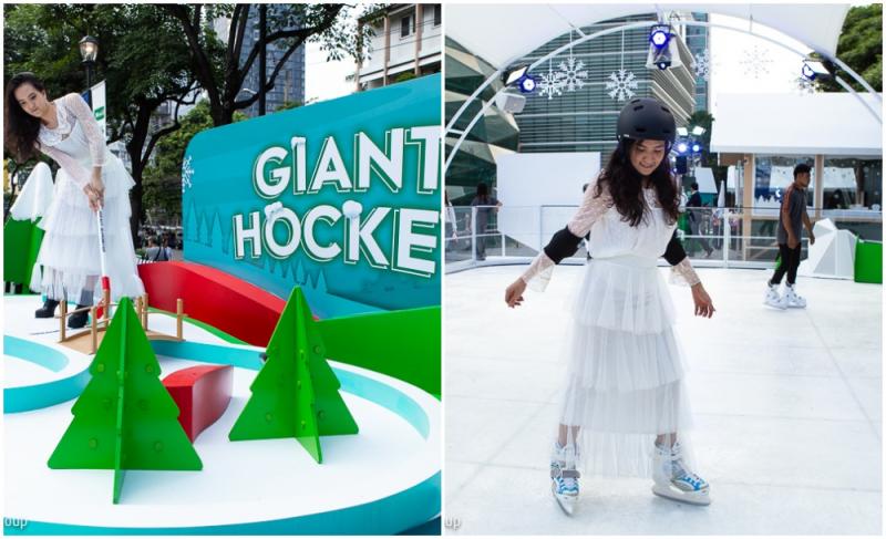 เดินเพลิน ๆ มาต่อที่งาน King Power Winter Village Presented by KBank โซนแรกที่จะเจอก็คือ Village Square ที่มีกิจกรรมสไตล์เมืองหนาวให้เราเล่น ทั้งฮอกกี้น้ำแข็ง ปาบอล ตกปลาจากบ่อน้ำแข็ง และลานไอซ์สเกตกลางแจ้งที่มีอุปกรณ์ป้องกันอย่างสนับเข่าและหมวกเตรียมไว้ให้พร้อมสรรพ